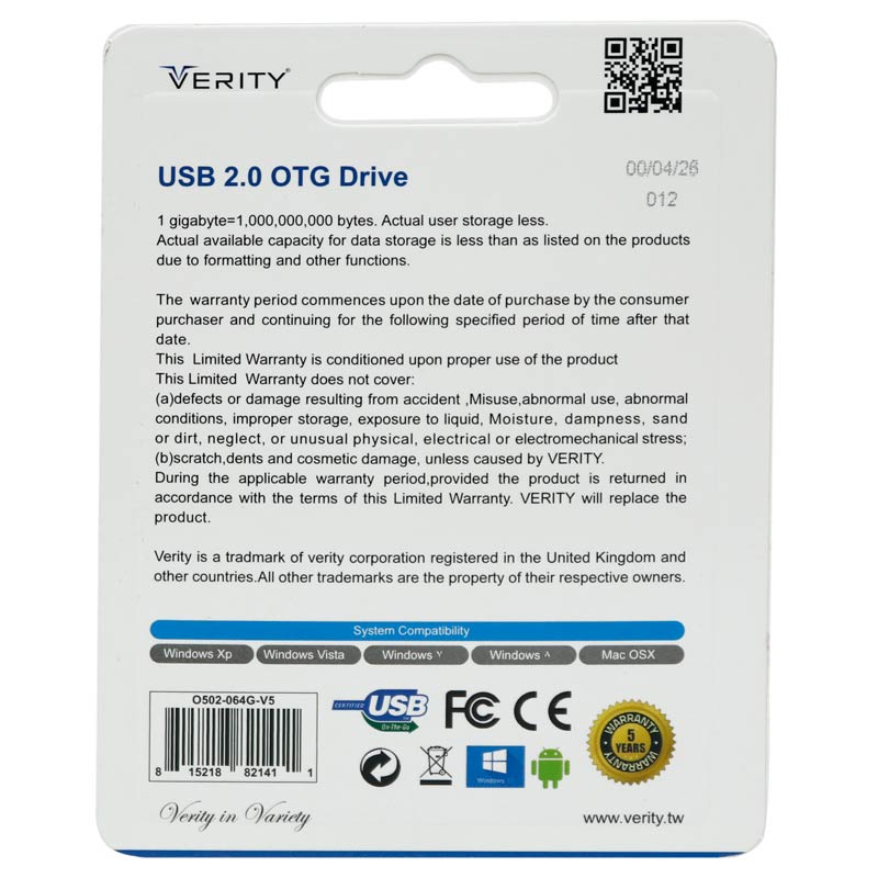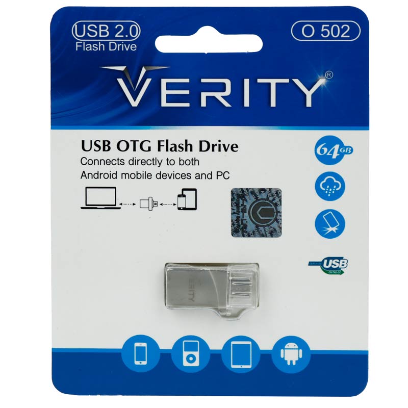 فلش وریتی OTG مدل O502 ظرفیت ۶۴ گیگابایت، رابط USB2.0 | بدنه ساخته شده از فلز | مجهز به رابط Micro USB | قابل استفاده به عنوان فلش OTG | سازگار با انواع سیستم عامل های ویندوز، مک و اندروید